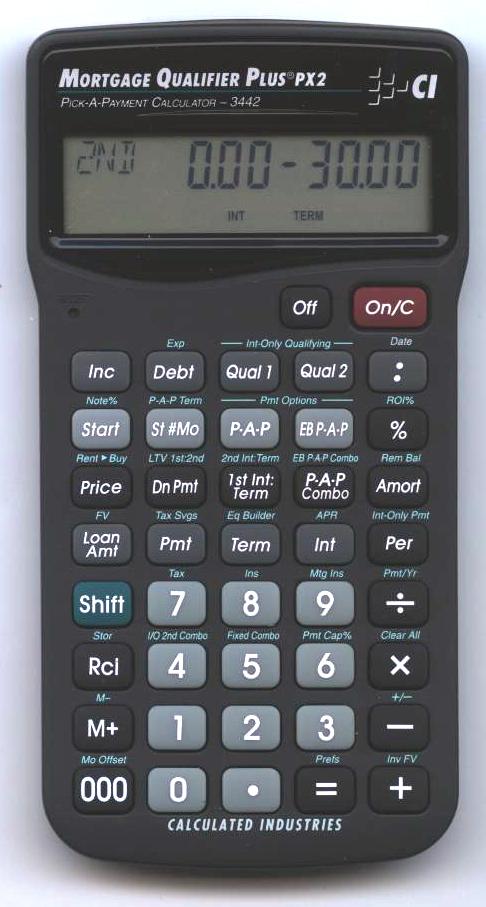 The Mortgage Qualifier Plus PX2 is designed for quick calculation of mortgage arithmetic. Its alternate name refers to its ability to expedite calculations on pick-a-payment loans and mortgages. This calculator is also available in a desktop version.