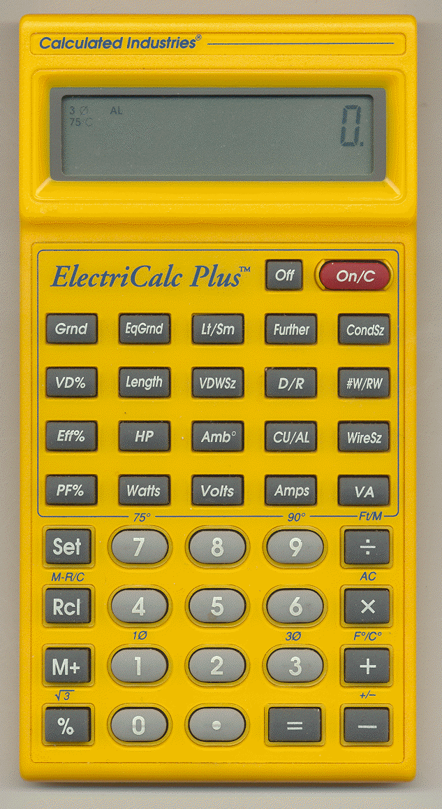 The ElectriCalc Plus is an early entry in a series of CI calculators for electrical calculations. Most are current with the National Electrical Code at the time of their release--and therefore they're obsolete when the code is changed. A recent model, the Electricalc Pro, is designed with a removable and upgradeable ROM chip to run around this difficulty.