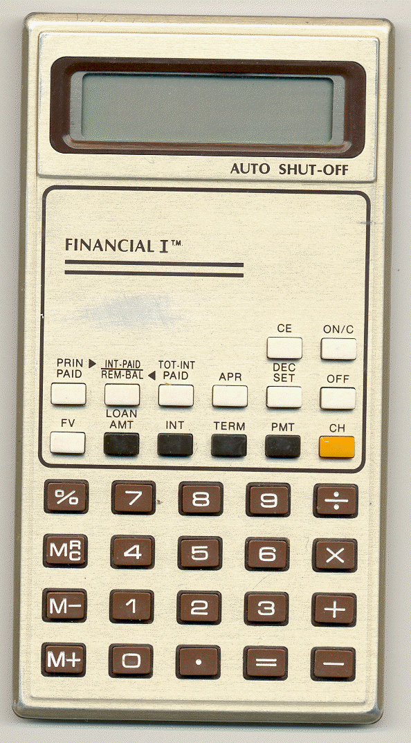 Following in the path of the Loan Arrangers, this touched off a line of CI "Financial" calculators. . It originally also bore the Loan Arranger name, but that was changed to Financial I following some trademark disputes with the Lone Ranger people--click here and scroll down for more details.