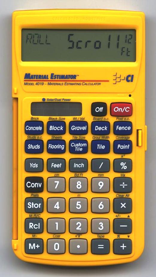 The Material Estimator continues CI's line of construction calculators, focusing on computations involved in ordering construction materials. The case includes a hinged cover and contains a pocket in the back for storing the users' guide, which is printed in both English and Spanish.