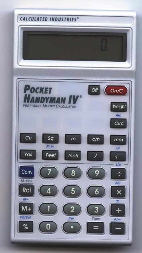 The fourth Pocket Handyman calculator maintained the simple features of the line but updated the case styling. In addition to basic scientific features, this calculator does simple unit conversions. It eventually morphed into the Measure Master Classic. Version 2.0 capitalized the name, but the functions are identical to Version 1.0 with the exception of the Ft-In function above the Feet key.