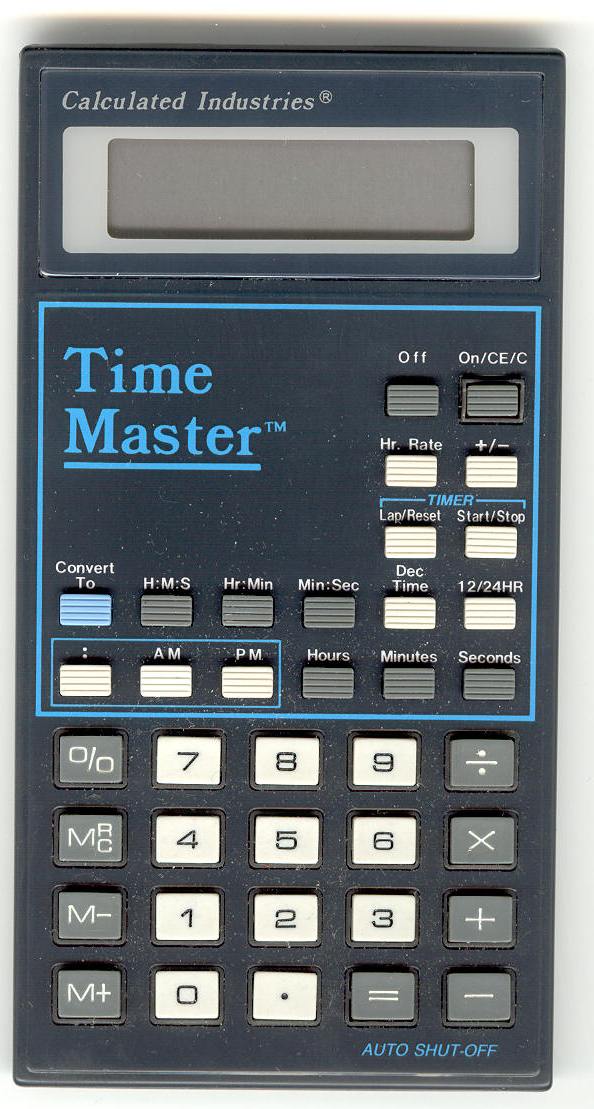 The Time Master was CI's first calculator with preprogrammed functions for clock calculations. It can convert between 12- and 24-hour clocks, perform arithmetic on clock values, and do elementary payroll calculations. Additionally, a timer with a lap function is built in.