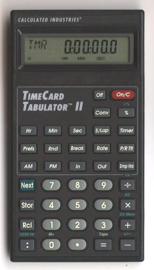 The Time Card Tabulator II simplifies payroll calculations (including breaks and overtime pay) and includes a timer, which is running in this scan. It is currently available in a darker case. This calculator is the second in a series of payroll calculators, beginning with 1993's Time Card Tabulator.