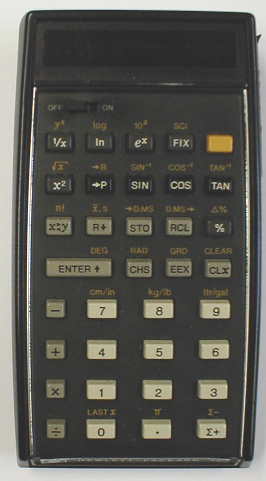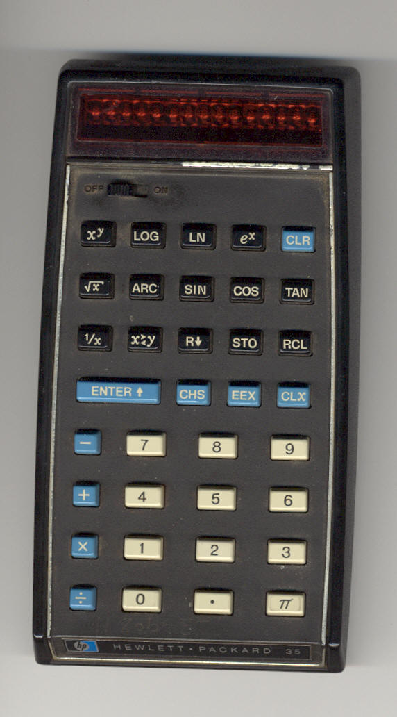HP-35: The first HP pocket calculator and the world's first scientific calculator, this particular model is the fourth of four designs. It is distinguished by key legends that are molded into the keys rather than printed on the keyboard--and thus will never rub off with use. The HP-35 was introduced in 1972 at a cost of $395. 31 years later, it still works fine with an AC adapter--the rechargeable battery pack has, however, held its last charge. Early HP calculators were noted for RPN logic, using an ENTER key rather than an = key for arithmetic operations.