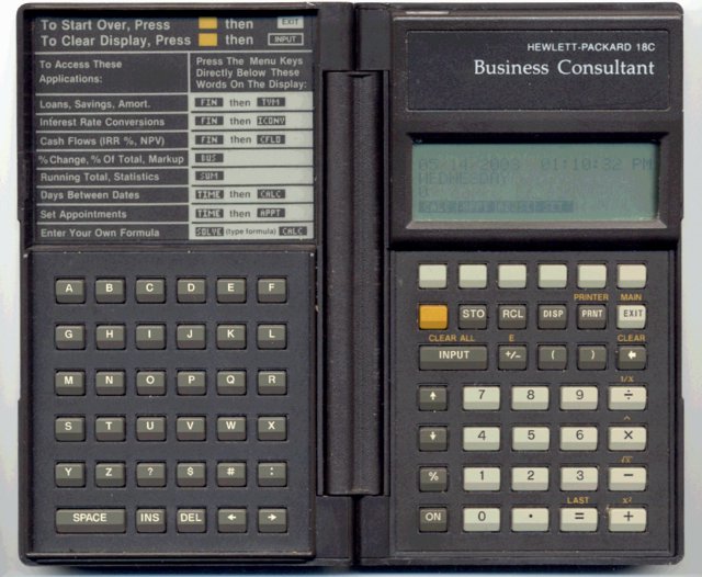 HP-18C Business Consultant: This notebook-format financial calculator includes an electronic datebook. It was introduced later than, but failed to supplant, the 12C.