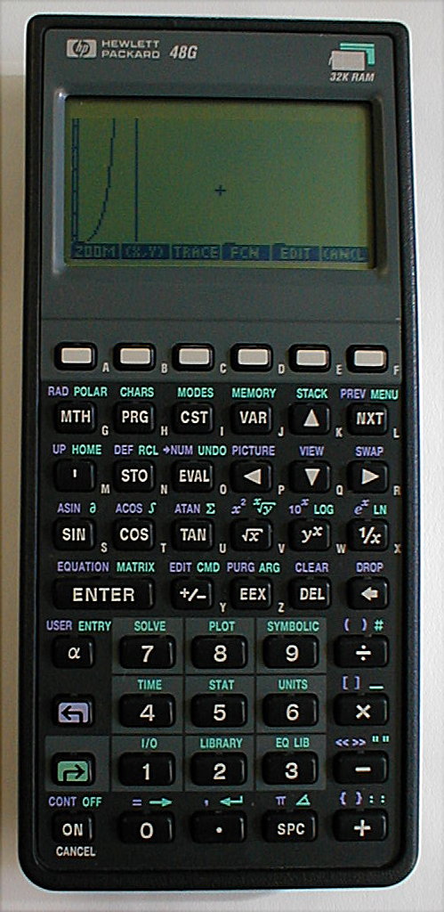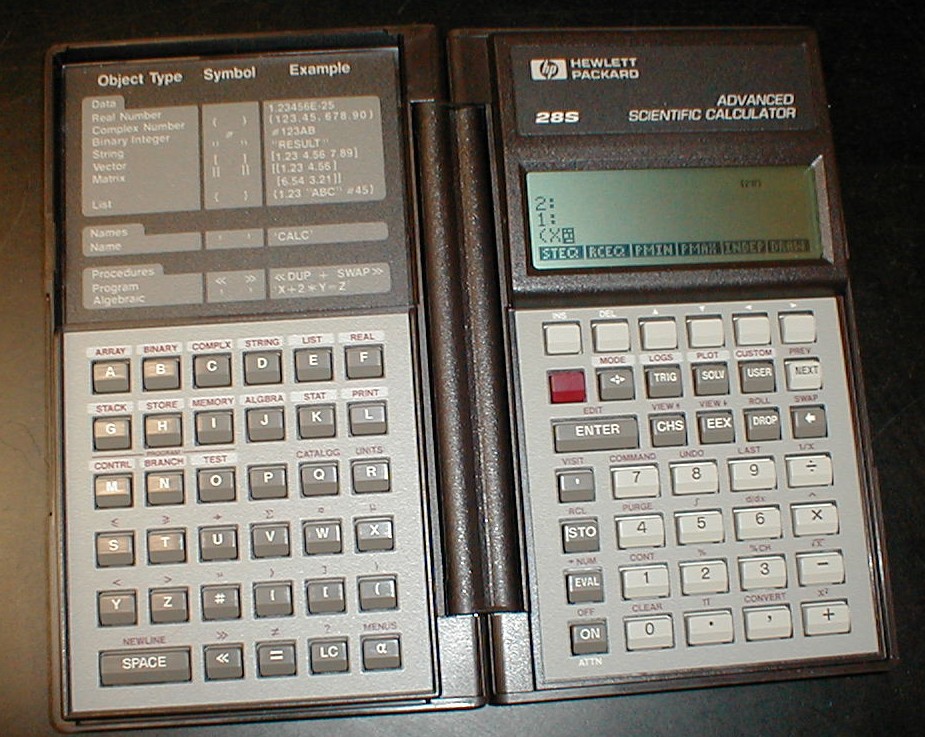 HP-28S: Hewlett-Packard's first graphing calculator, in the notebook format with an alphabetic keyboard to the left. This calculator is on permanent loan from the Albion College Department of Mathematics and also does symbolic manipulation.