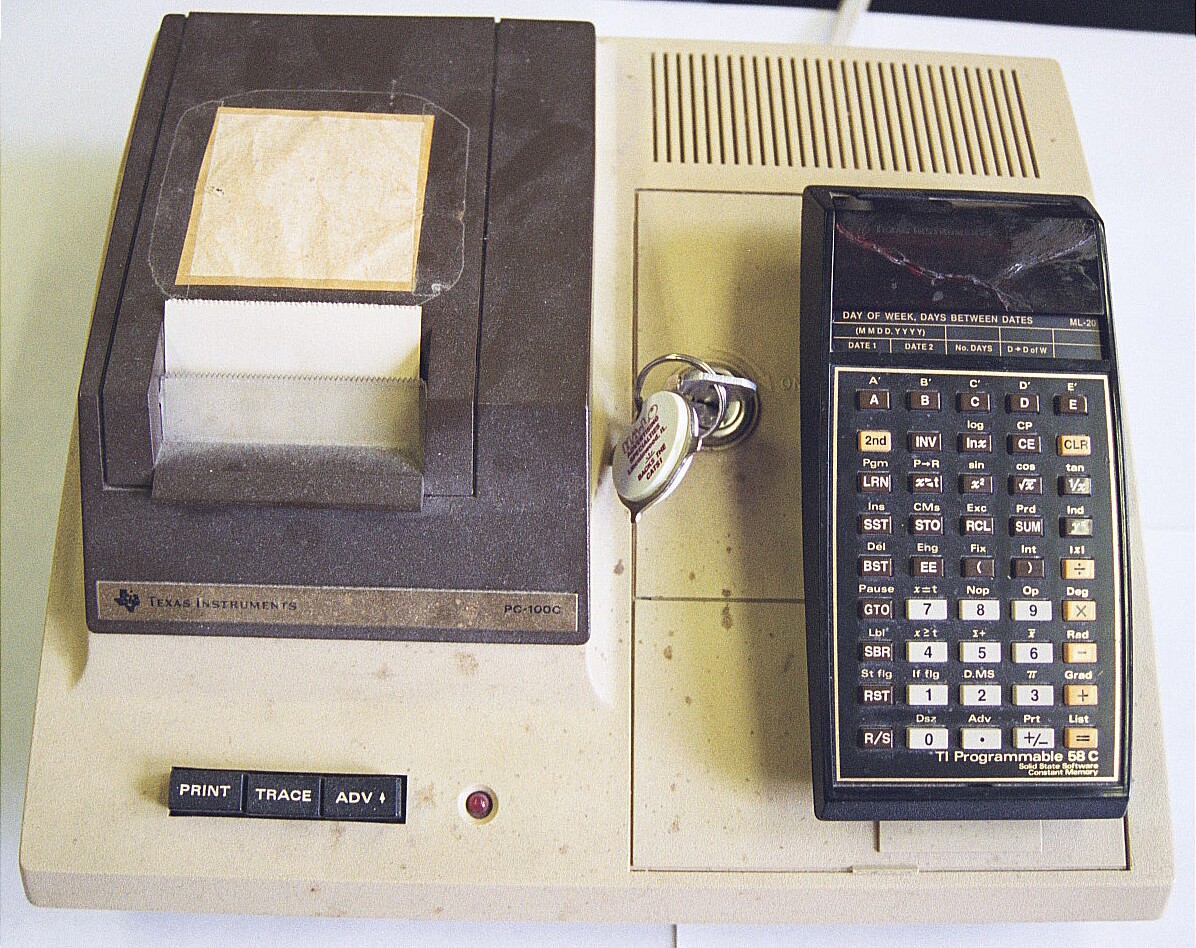 TI-58C calculator with PC-100C printer. My second programmable calculator (01981; printer 01982) and the machine that took me through one year of high school (and several lunch periods playing the Sea Battle game on circular graph paper), 4 years of college, 3 years of grad school, and the 2 years of my first teaching job--and it shows!. I finally replaced it when the second battery pack went dead for good, although the package shown here still runs off AC current.