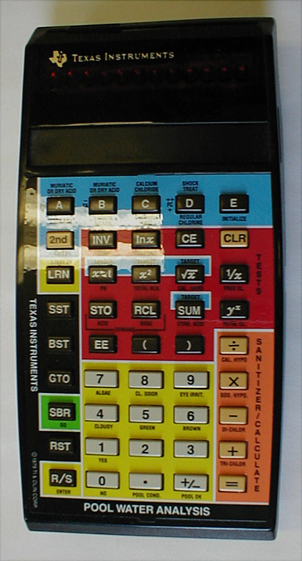 TI-58C with Pool Water Analysis module: Unlike the other TI ROM modules, the Pool Water Analysis module uses a keyboard overlay rather than a card in the top slot to redefine keys for its functions. With the PWA module, a swimming pool owner could do all the calculations necessary to keep a pool's chemistry properly adjusted. Interesting input options include "Cloudy", "Green", and "Brown" [on the 4, 5, and 6 keys] to indicate water color--although my personal opinion is that if you have a pool full of brown water, you need help beyond what a TI-58C will provide...