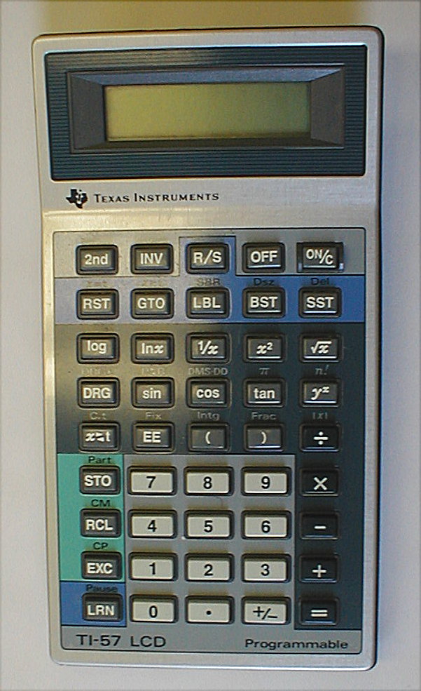 TI-57 LCD: The functionality of the TI-57 packaged into the angled case used by TI in the early 01980's.