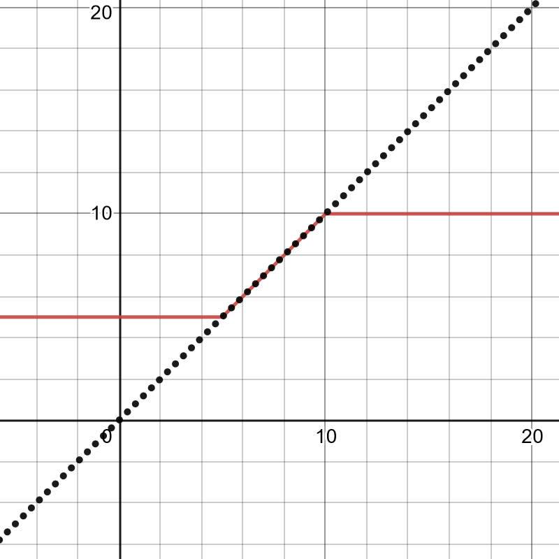 The constrain function limits the upper and lower bounds of a variable. \[ {\rm constrain}(x,a,b) = \begin{cases} a, & \text{if \(x \lt a\)}\\ b, & \text{if \(x \gt a\)}\\ x, & \text{otherwise} \end{cases} \] For example, the graph below shows y = constrain(x,5,10) in red. The graph of \(y = x\) (unconstrained) is show as a dotted line.