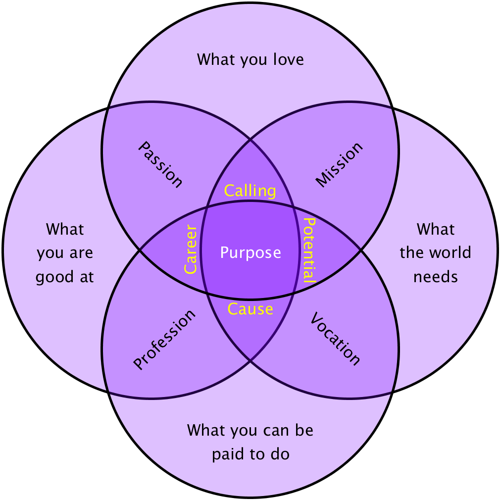 One way to identify a purpose in your life is to look at the intersection of these sets, as indicated below. Read more about this process at the page Purpose Venn Diagram from Human Business.